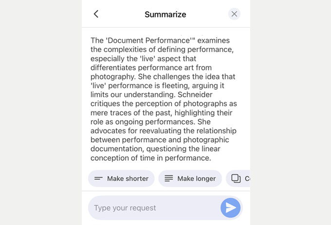 Let’s say, for example, you want to summarize a document stored on your phone. Here’s how it works using the AI text generator: